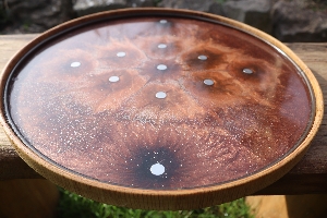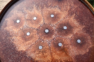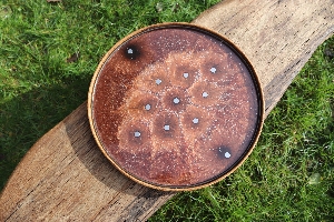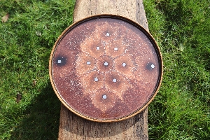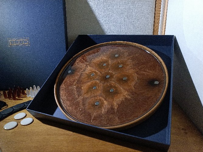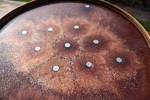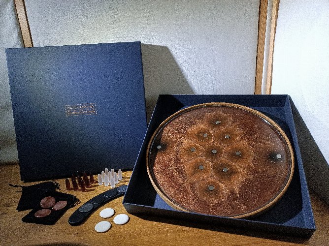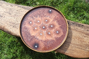 "Copper Leaf #1" is a beautiful metallic copper leaf design with stained wood finish and encased wound metal rope bumper. It has glitter and fabulous flowing leafy lines, with punchy dark dyes around the home bases. Perfect for playing any time of course, but especically delightful in the fall or when the copper beech is in full leaf. Every board comes with two balls, two sets of meekones (markers), two sets of scoring tokens and a scoreboard. See how to play Kapture 9 here.