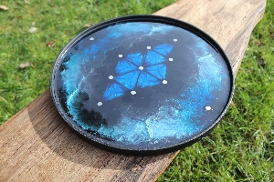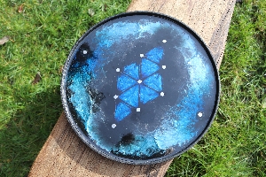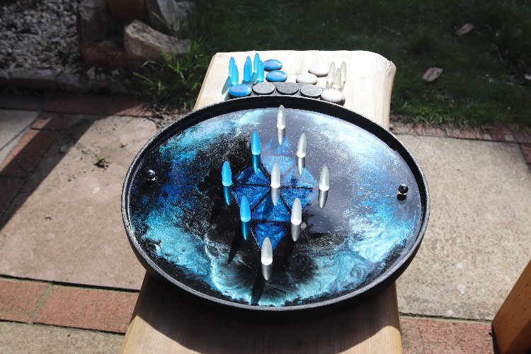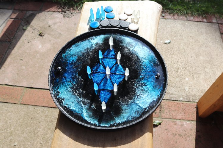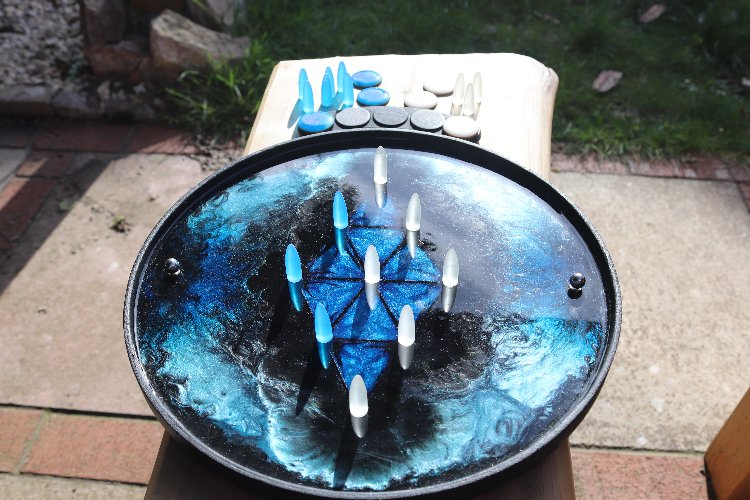 Tempest #1, a first iteration design, is a deep rich storm of metallic shimmering and shining blues that delight the eye but are surprisingly hard to capture on camera! If you like the photos you will LOVE the reality of this design. Another deluxe edition with full lattice work in the deep blue diamond. Every board comes with two balls, two sets of meekones (markers), two sets of scoring tokens and a scoreboard. See how to play Kapture 9 here.