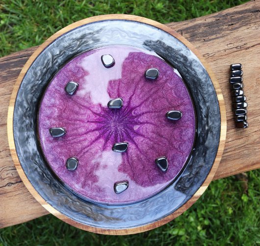 Purple Star #1 is a striking purple star-like design with web-like tendrils reaching toward the silvery cloud swirl of the border. The game includes the board which is approximately 30cm diameter and a set of 20 magnetite stones. Take turns to place the hematite stones inside the ring without any snapping together or take them off the board! First player to place all their stones wins. There is a video in the gallery showing how to play. NB the board in the video is NOT this board. The board in the photos here show the board that's actually for sale here. You can download the rules too from the Rules page.. Thanks!