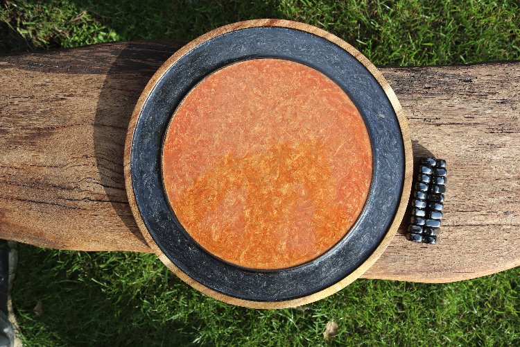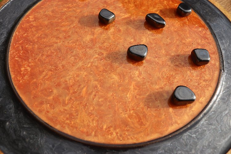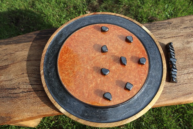 Star Fire #3 features the popular orange and black Star Fire theme, though this design is a little more zen than its predecessors, and ideal for those with a calmer, more strategic disposition. Take turns to place the hematite stones inside the ring without any snapping together or take them off the board! First player to place all their stones wins. There is a video in the gallery showing how to play. NB the board in the video is NOT this board. The board in the photos here show the board that's actually for sale here. You can download the rules too from the Rules page.. Thanks!